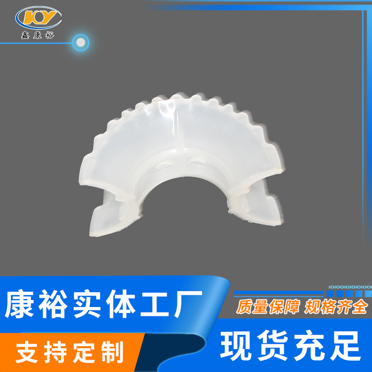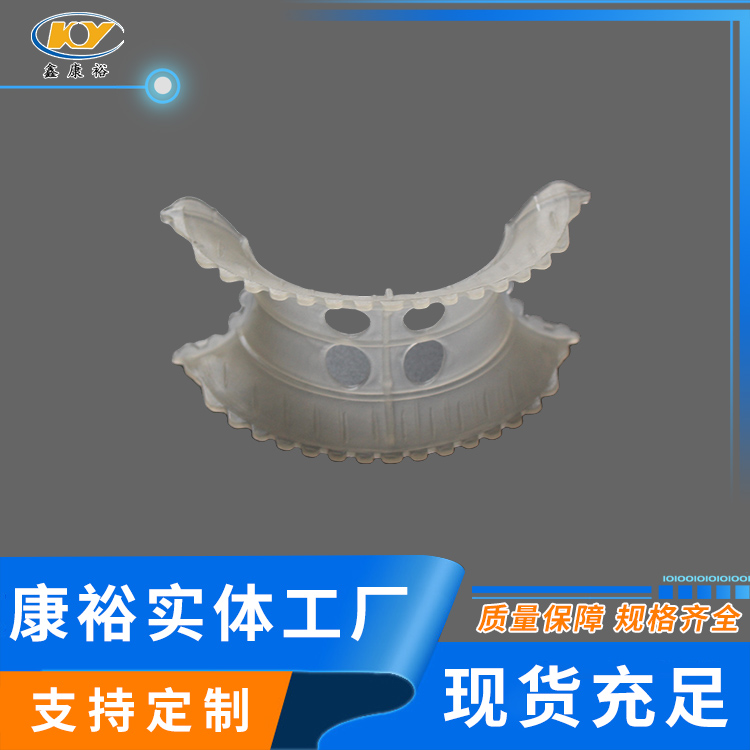 塑料異鞍環(huán)是20世紀(jì)70年代美國Noton公司對普通矩鞍環(huán)填料作出了改進(jìn),其特點(diǎn)是將扇形弧面改進(jìn)成帶鋸齒邊緣的貝殼狀弧面,并在鞍背上增加了開孔,這樣填料層內(nèi)的通道更加通暢,改善了液體分布性能,降低了氣體通過的阻力,提高了傳質(zhì)性能。塑料異鞍環(huán)鞍形填料類似于馬鞍形狀,這種填料層中主要為弧形的液體通道,填料層內(nèi)的空隙較環(huán)形填料(尤其較拉西環(huán)填料)更加連續(xù)。